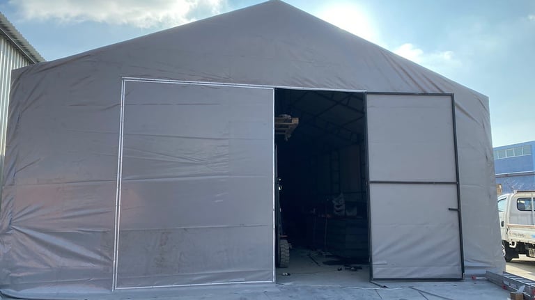 Dayanıklı branda kaplama sistemiyle üretilen bu depo çadırı; malzeme, ekipman ve ürünlerin güvenli şekilde korunmasını sağlar. Hızlı kurulumu ve ekonomik yapısıyla her alana uyumludur.